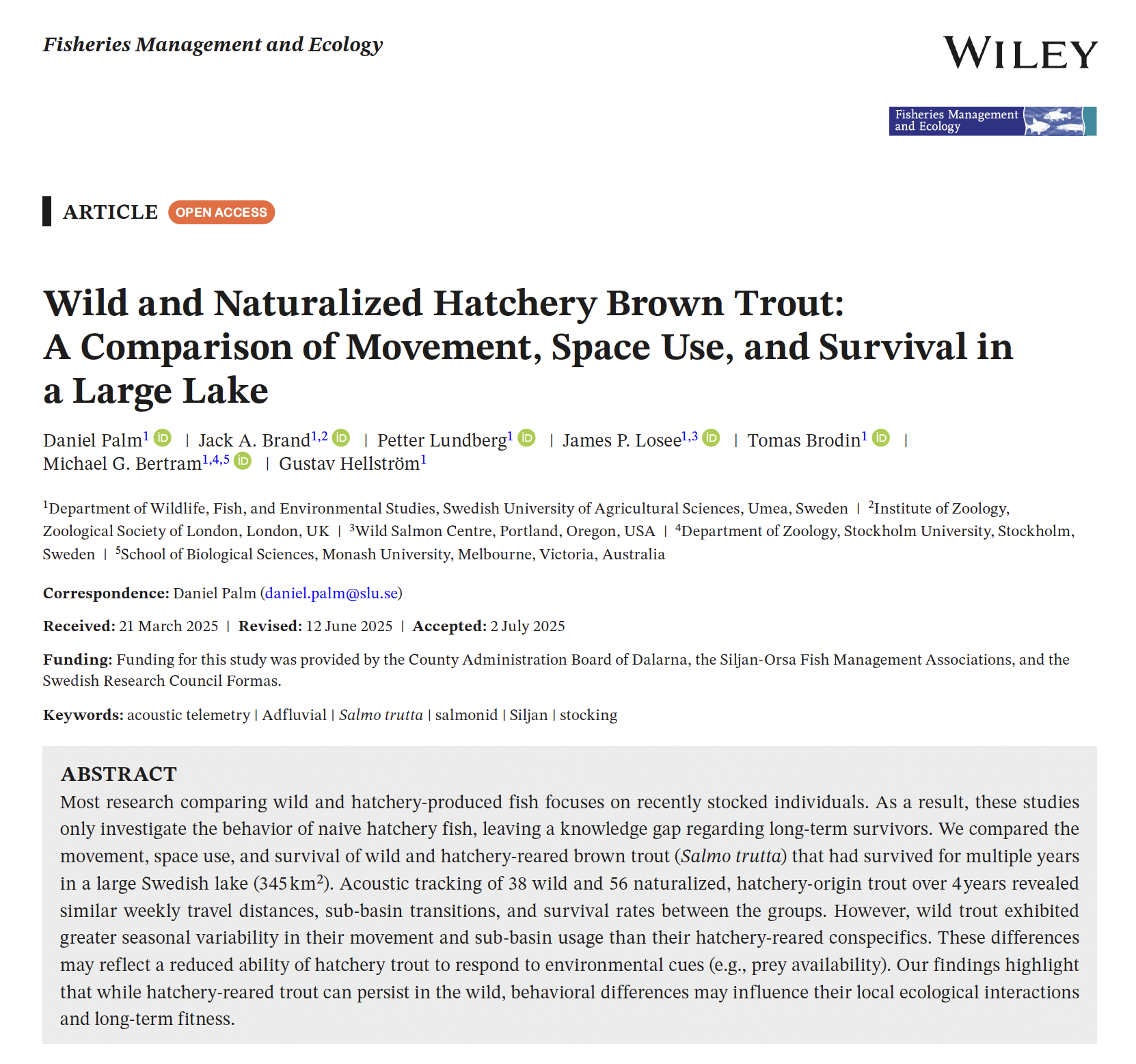Palm, D., Brand, J.A., Lundberg, P., Losee, J.P., Brodin, T., Bertram, M.G., Hellström, G. 2026. Wild and naturalized hatchery brown trout: a comparison of movement, space use, and survival in a large lake. Fish. Manag. Ecol. 33, 14–23. https://doi.org/10.1111/fme.70004 | PDF